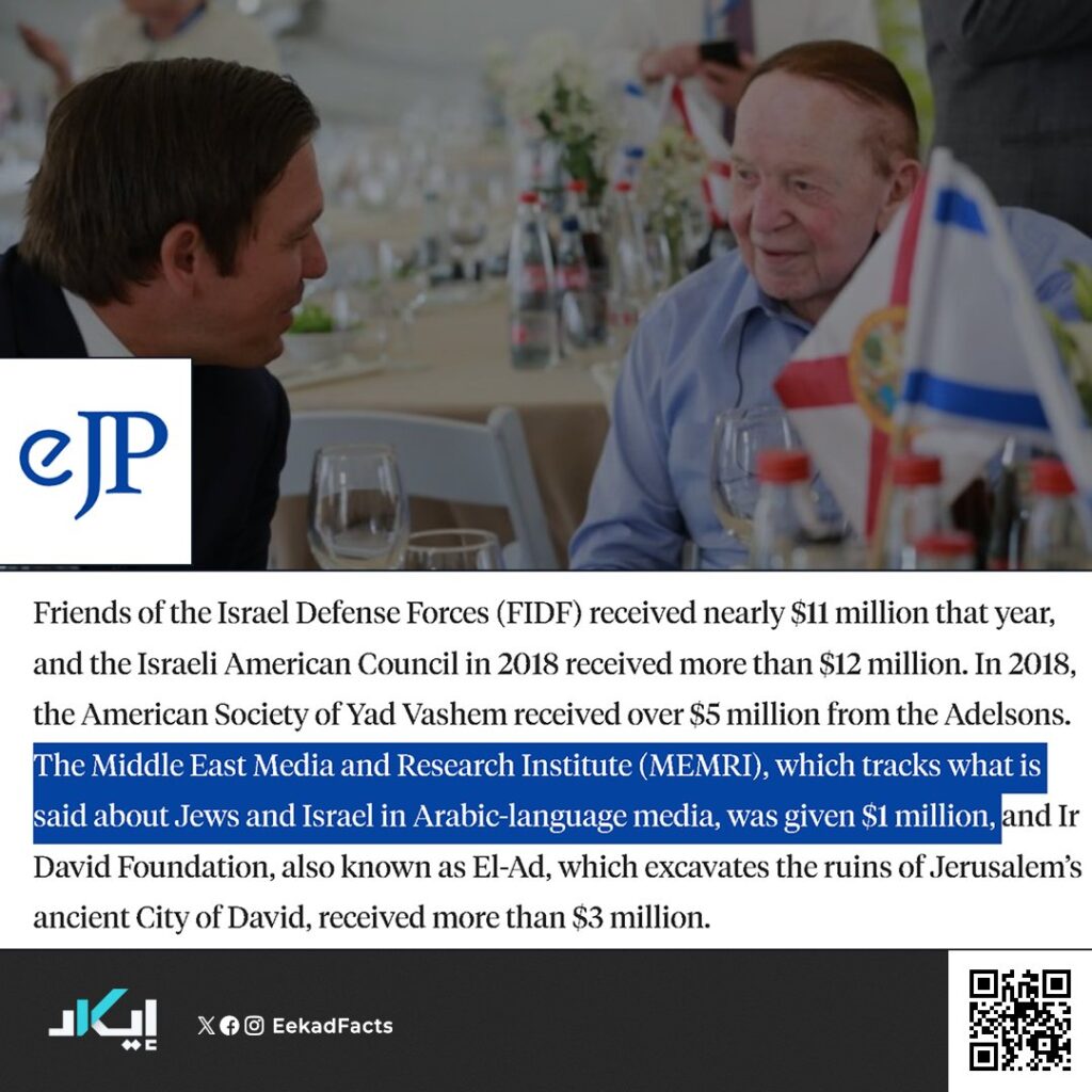 بجانب المنظمات الصهيونية السابقة، دعمت كذلك عائلة “أديلسون” معهد الشرق الأوسط للإعلام والبحوث “MEMRI” بأكثر من مليون دولار عام 1439هـ (2018م). تم تأسس المعهد عام 1418هـ (1998م) على يد ضابط الاستخبارات “الإسرائيلي” السابق “ييجال كارمون”.