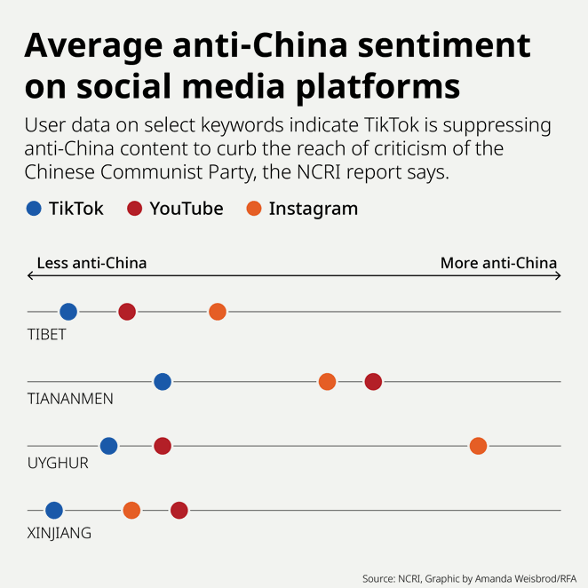 وجد بحث NCRI أنه عند استخدام “تيك توك” للبحث عن مصطلحات مثل “التبت” أو “الأويغور” أو “مذبحة تيانانمين عام 1989” ، كان ما بين 61٪ و 93٪ من النتائج إما مؤيدة للصين أو غير ذات صلة، بينما شكل المحتوى المناهض للصين 5٪ فقط.