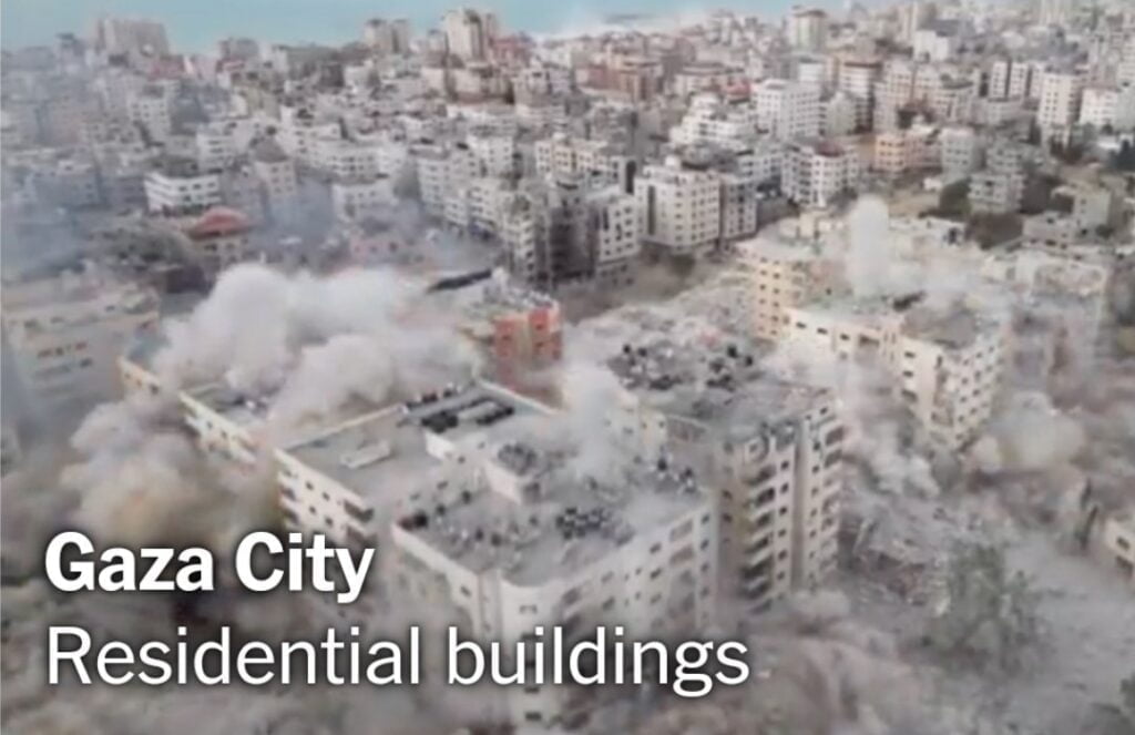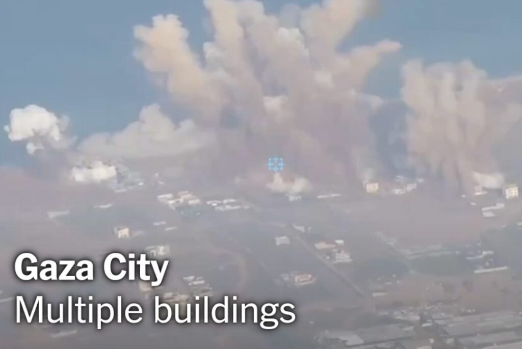 في أحد مقاطع الفيديو لعملية الهدم في أواخر نوفمبر/تشرين الثاني، أدى انفجار محكوم إلى تدمير ما لا يقل عن أربعة مباني سكنية شاهقة على بعد بنايات من مستشفى كبير في مدينة غزة. ودمرت عملية هدم أخرى في ديسمبر/كانون الأول أكثر من 12 مبنى حول ساحة فلسطين المركزية بالمدينة، والتي قال الجيش الإسرائيلي إنها تضم شبكة كبيرة من الأنفاق.